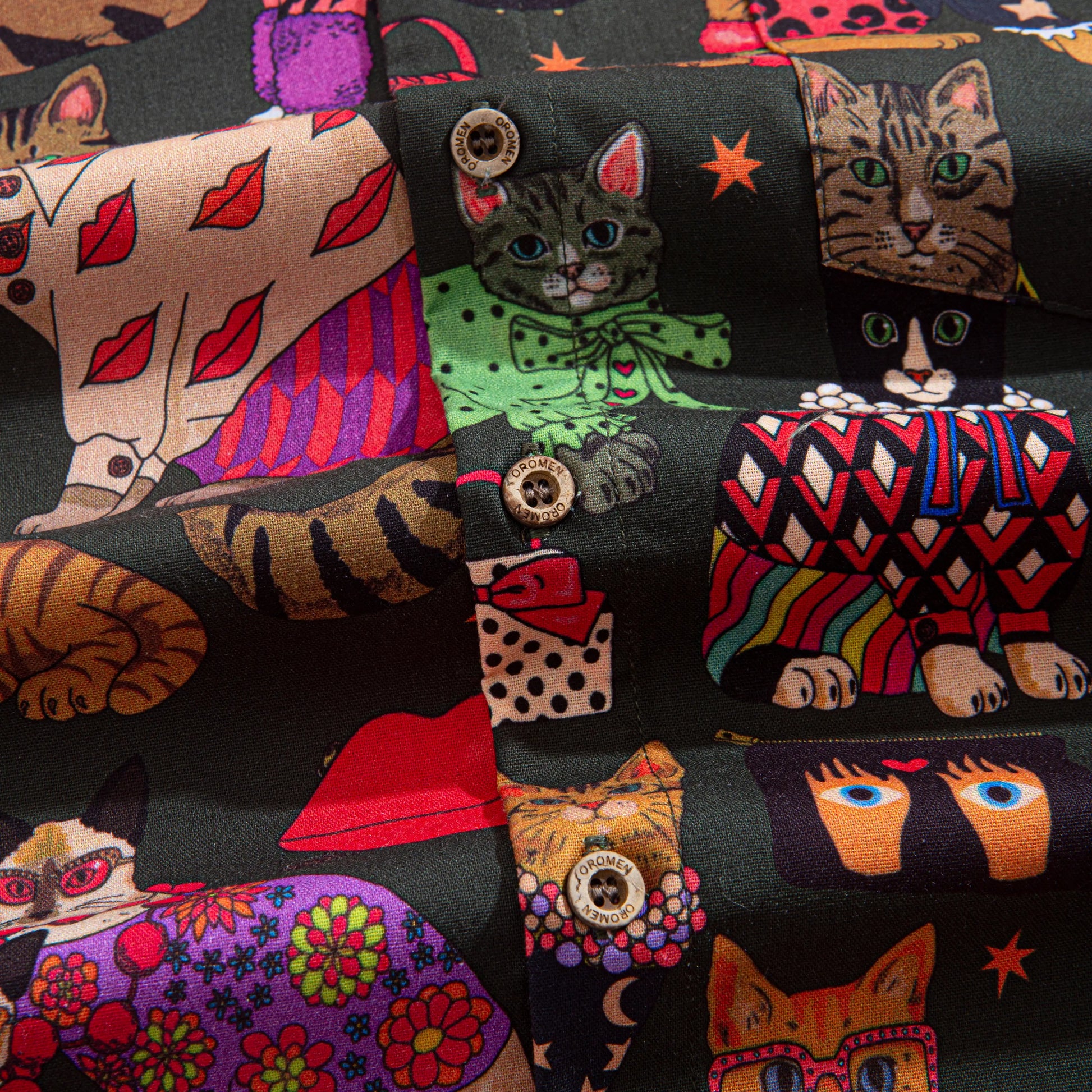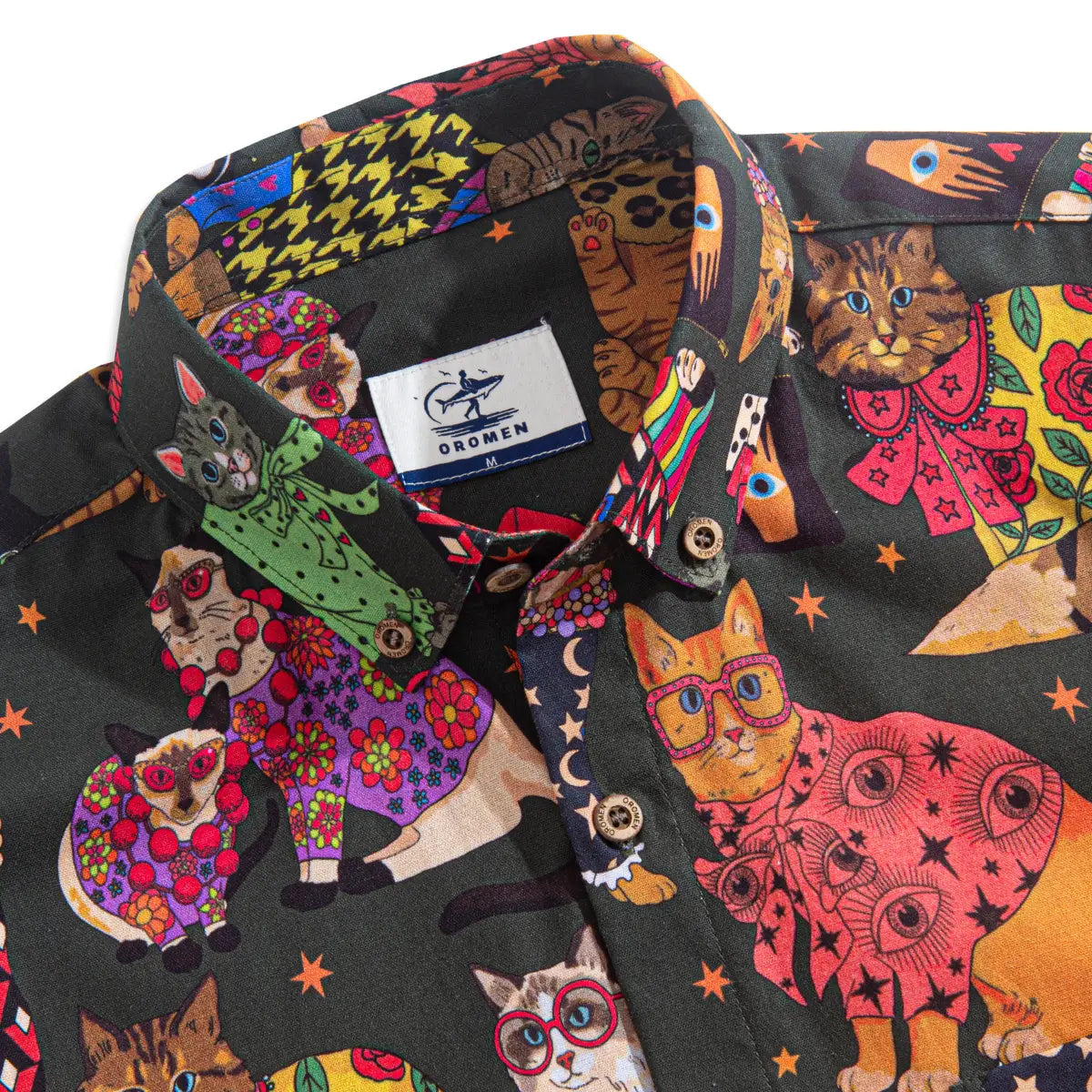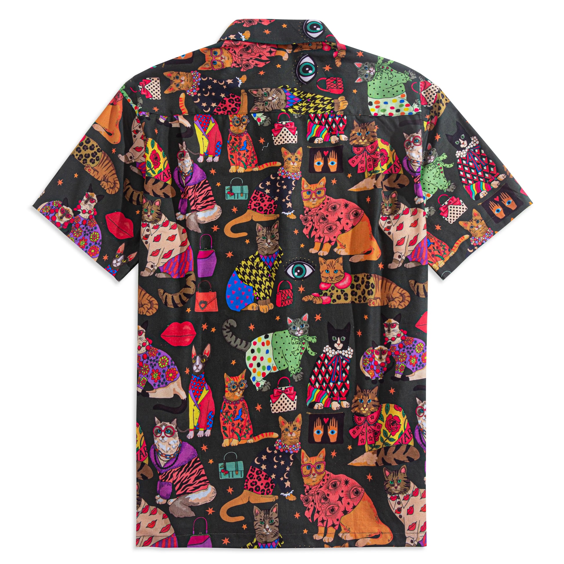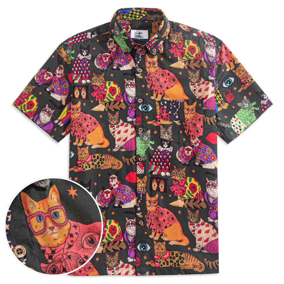 Put on this playful Hawaiian shirt and immerse yourself in the fantastical charm of the Baroque era, where elegant cats revel in grandeur! Each feline is adorned in lavish, enigmatic Baroque-style attire—all rendered in vibrant tropical hues.