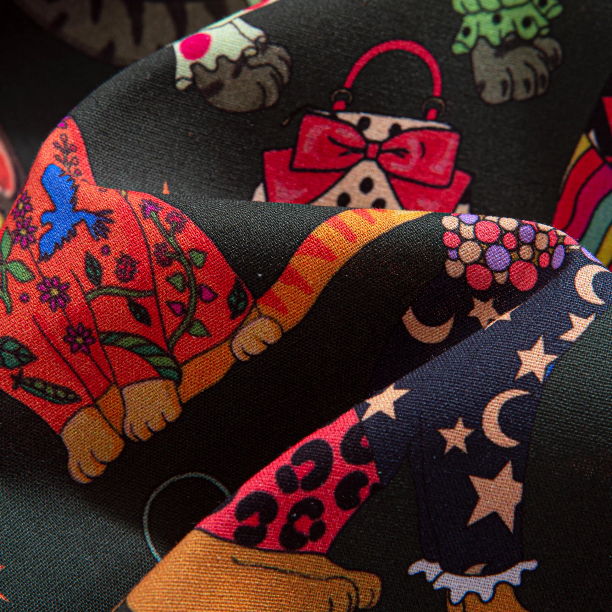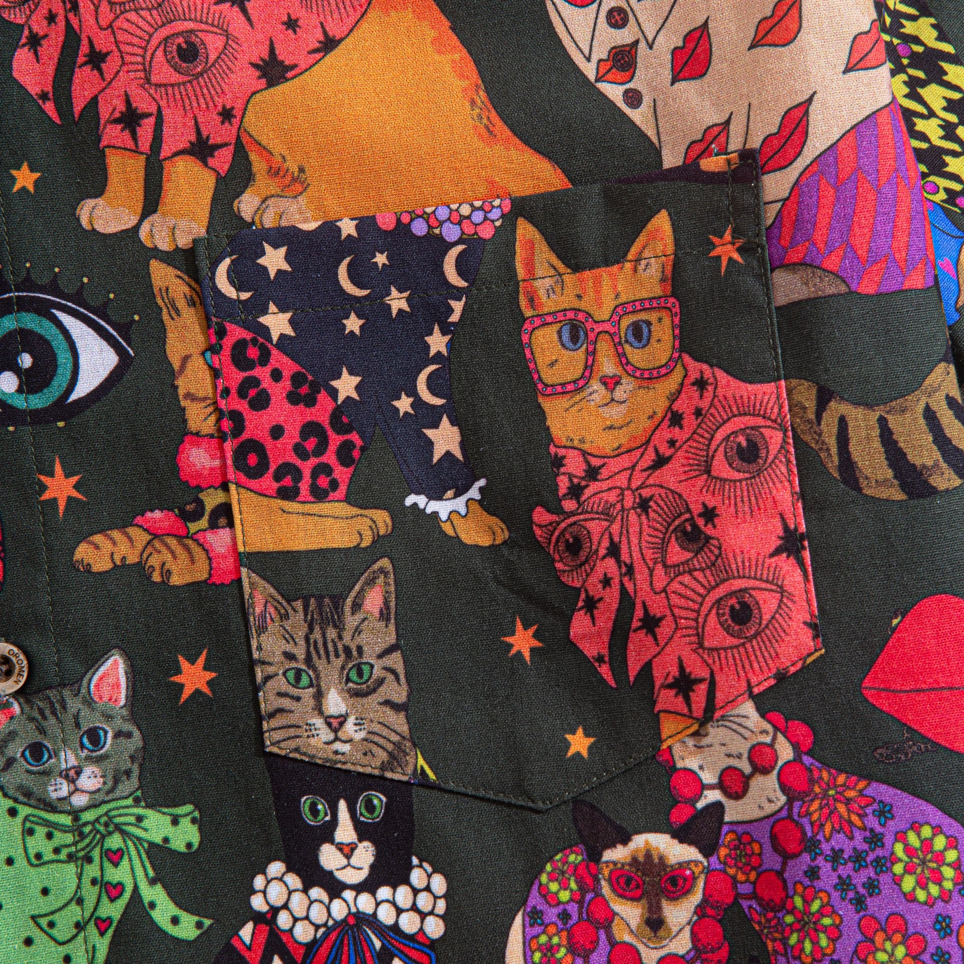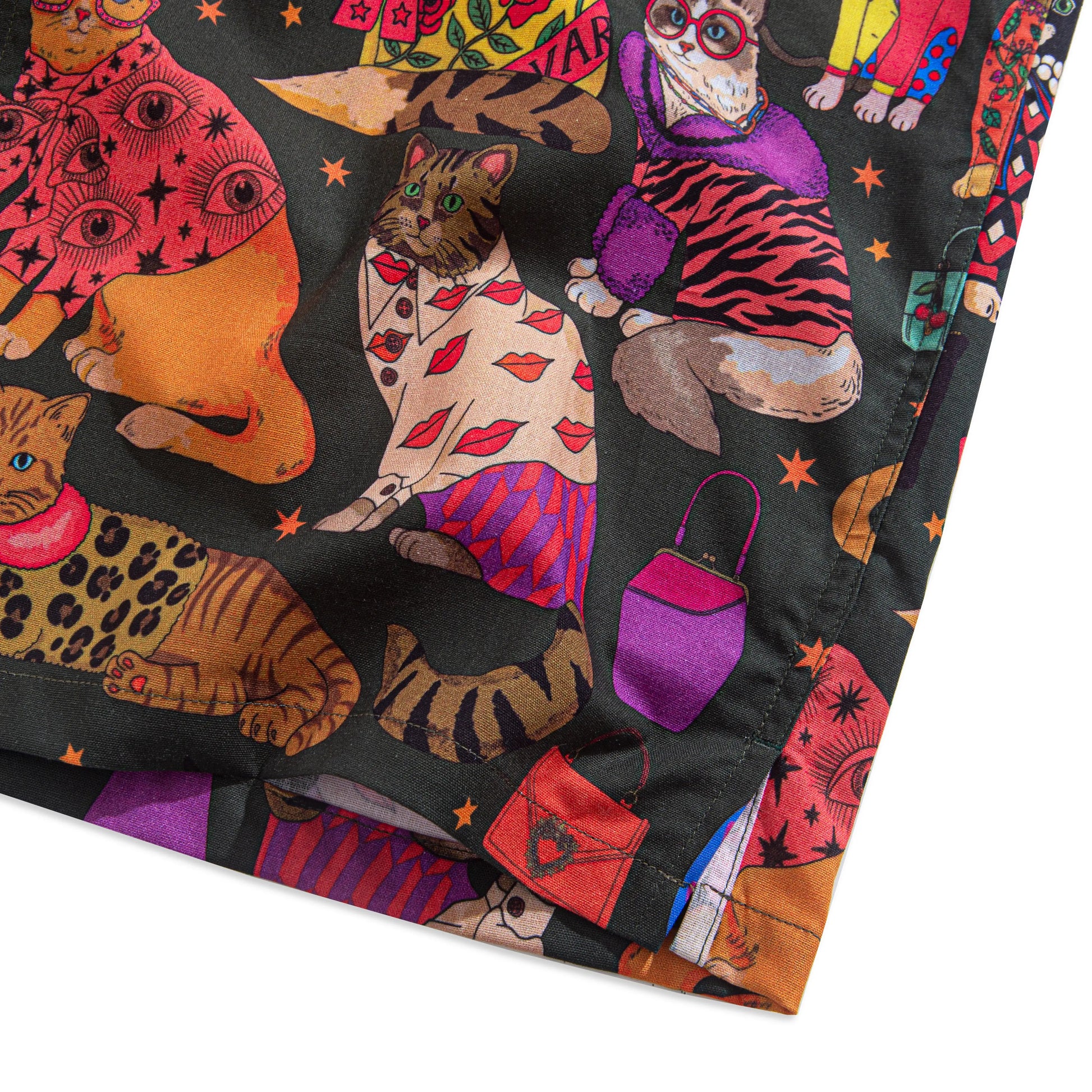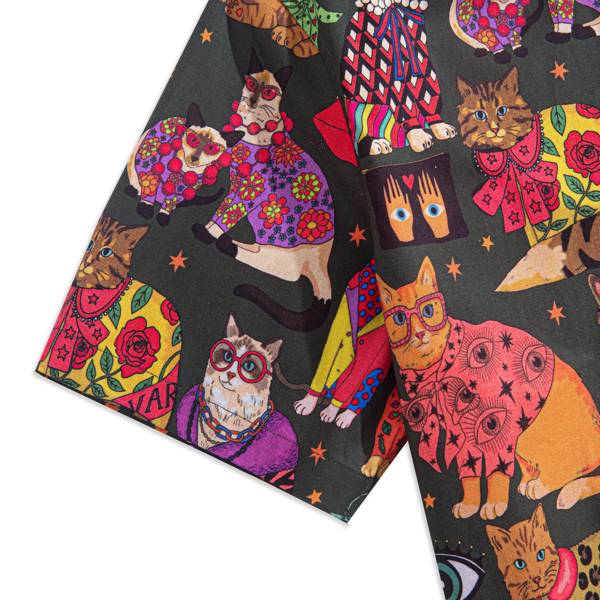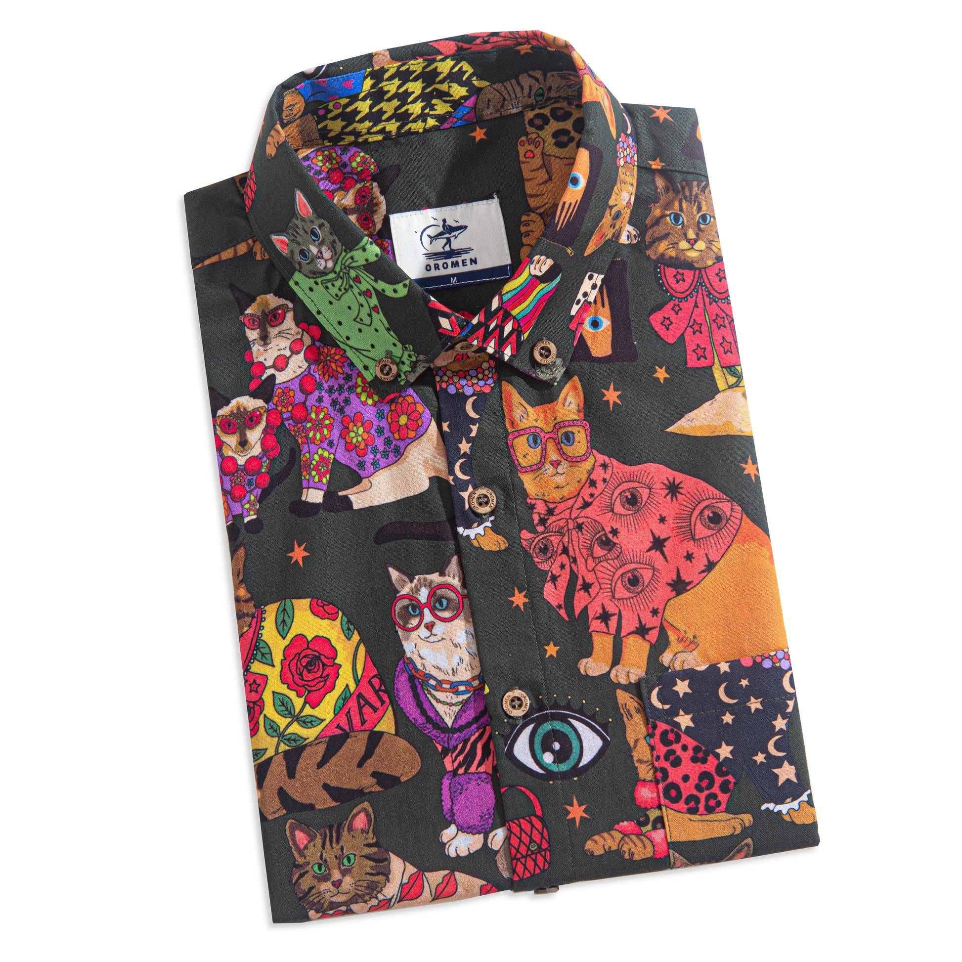 Put on this playful Hawaiian shirt and immerse yourself in the fantastical charm of the Baroque era, where elegant cats revel in grandeur! Each feline is adorned in lavish, enigmatic Baroque-style attire—all rendered in vibrant tropical hues.
