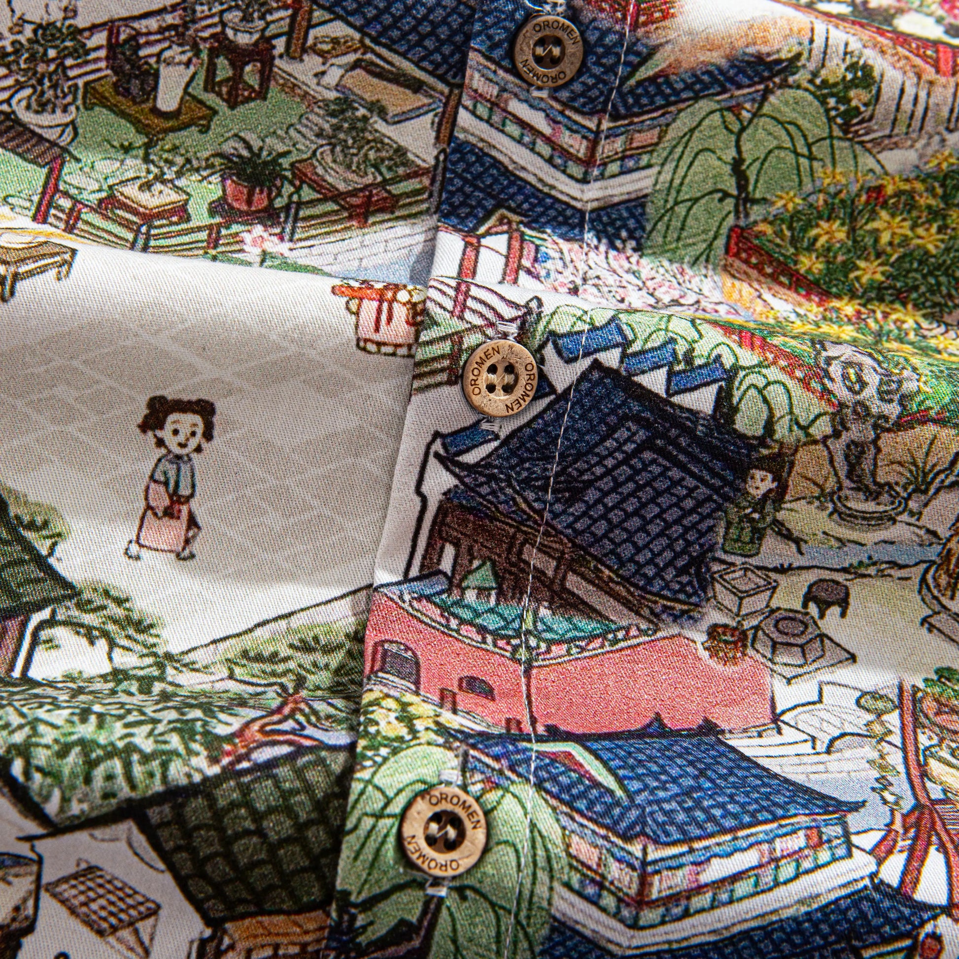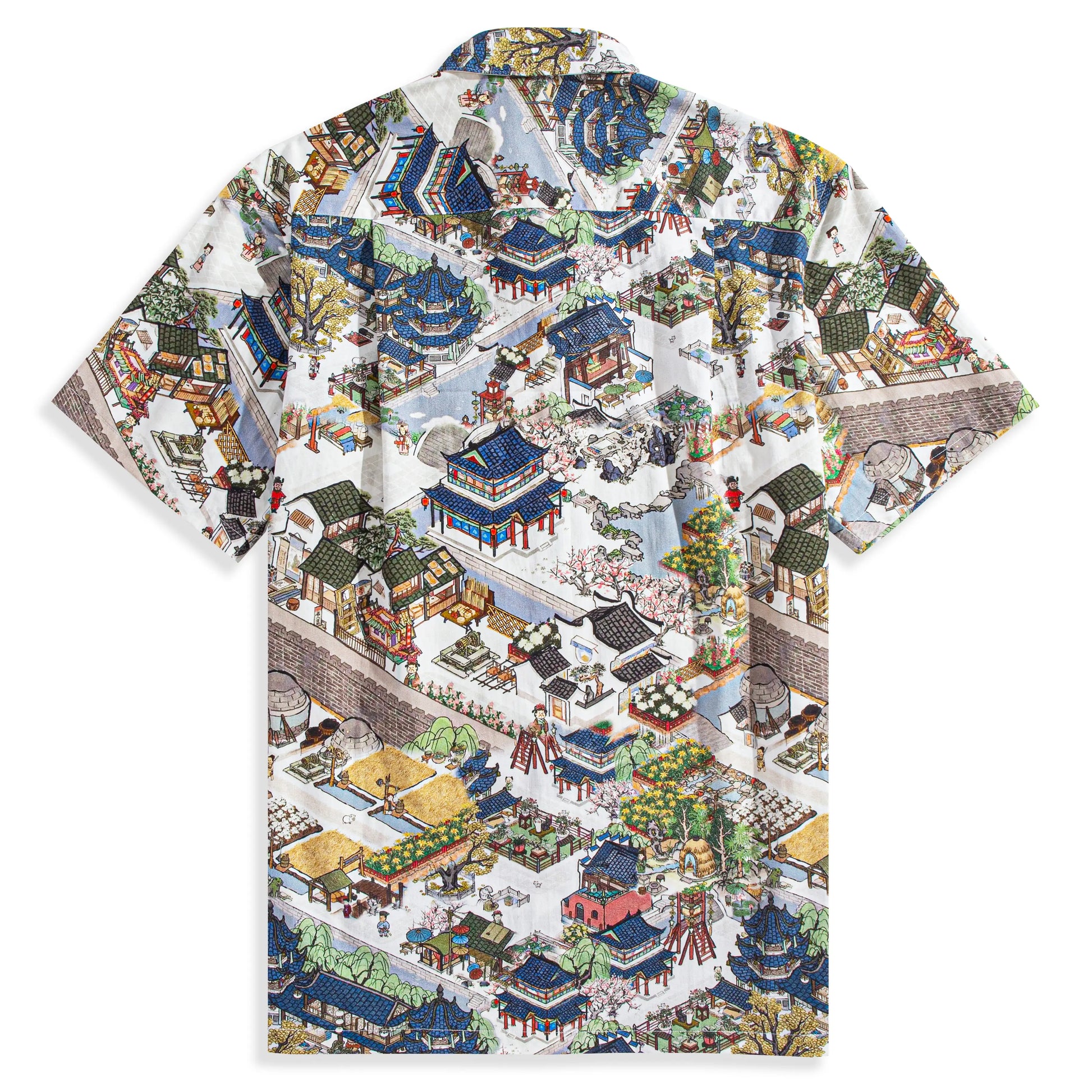 In this Ink painting style vivid picture, the colors are bright, and the characters are lively and interesting; The combination of courtyard architectural design and vivid characters makes the whole shirt full of vitality and vigor, and also shows a deep cultural heritage.