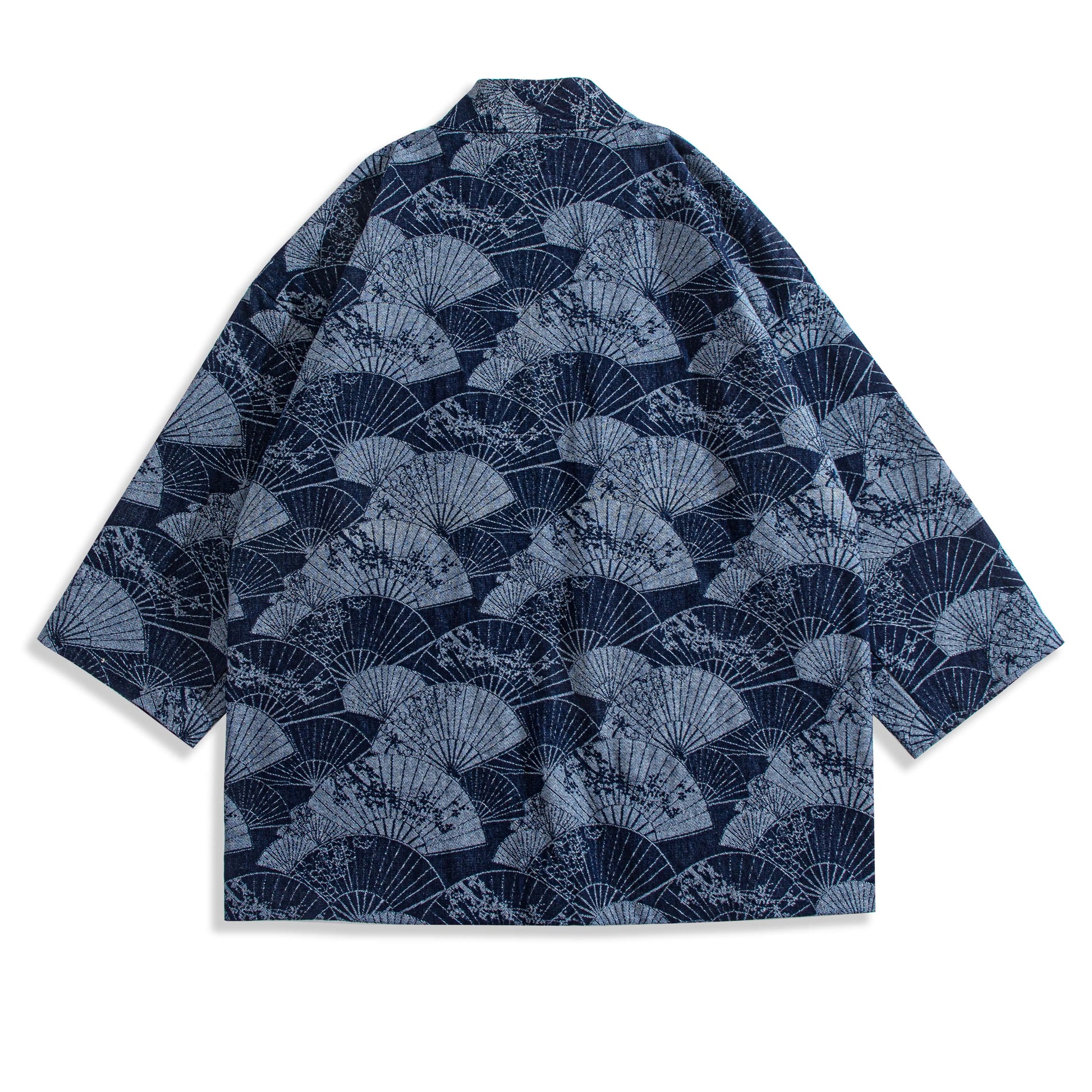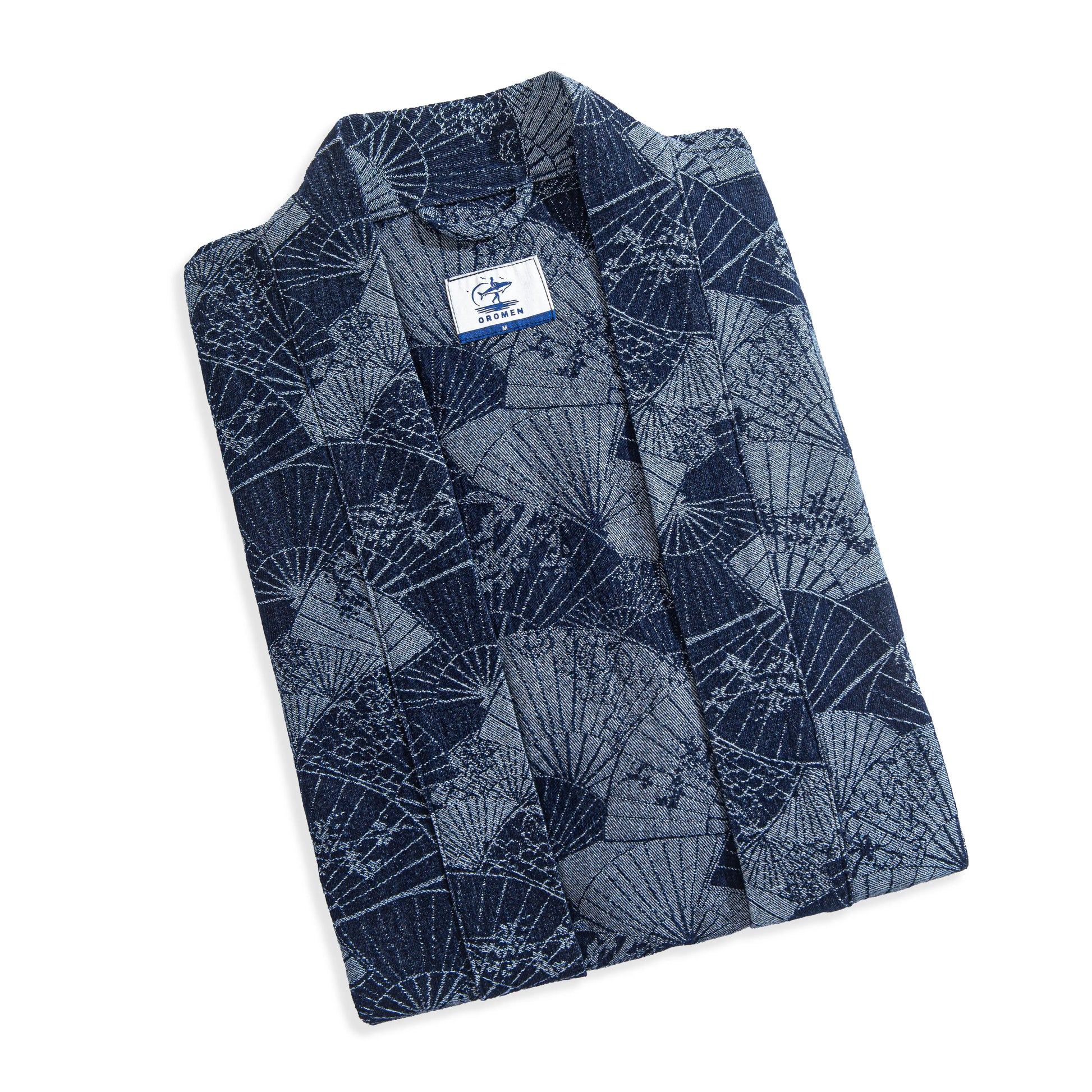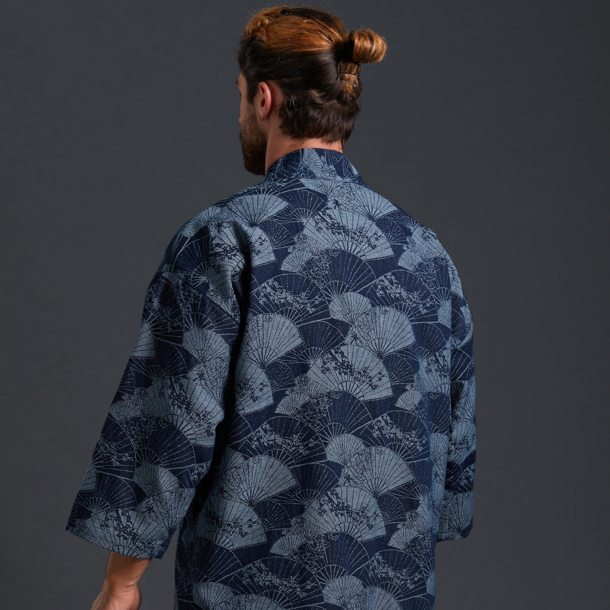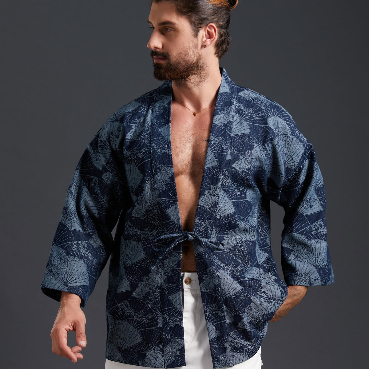 Carefully sewn from high-quality cotton and hand-dyed in the Japanese artist design – the iconic 'Flower Umbrella' pattern – this [Kimono Haori Jacket] presents a uniquely rustic texture due to its subtly uneven weave.