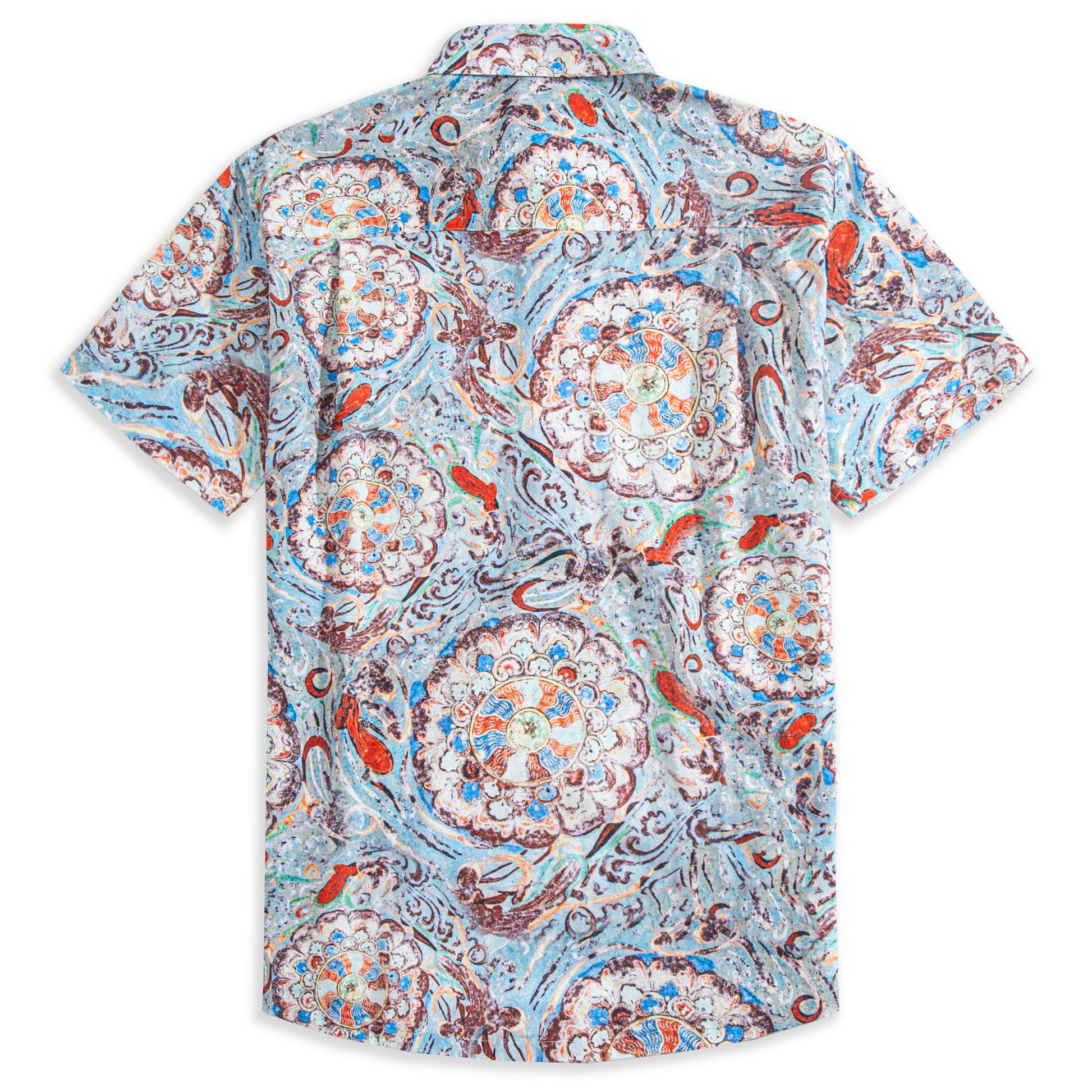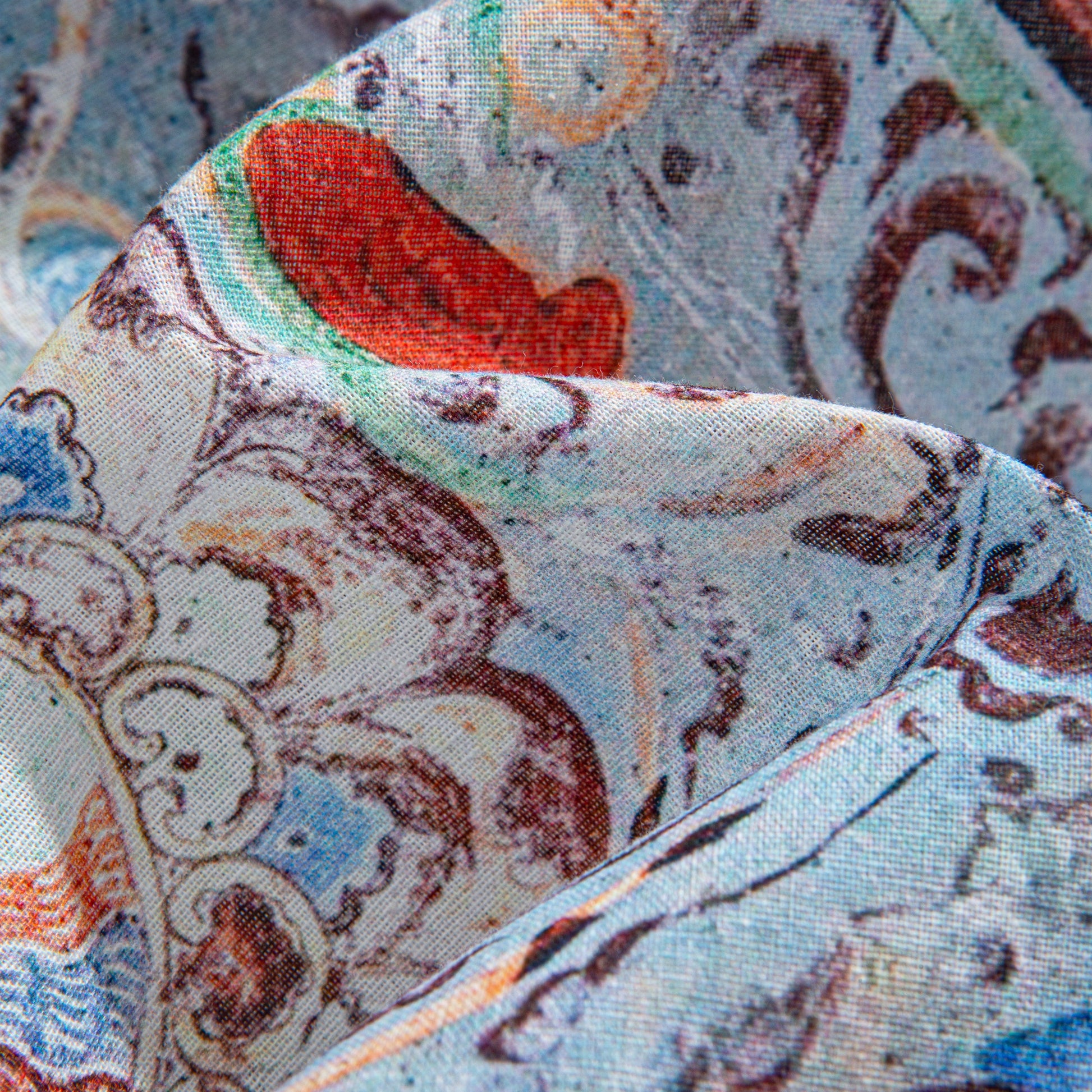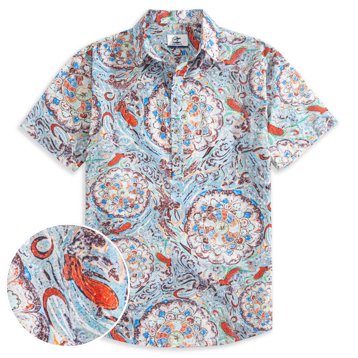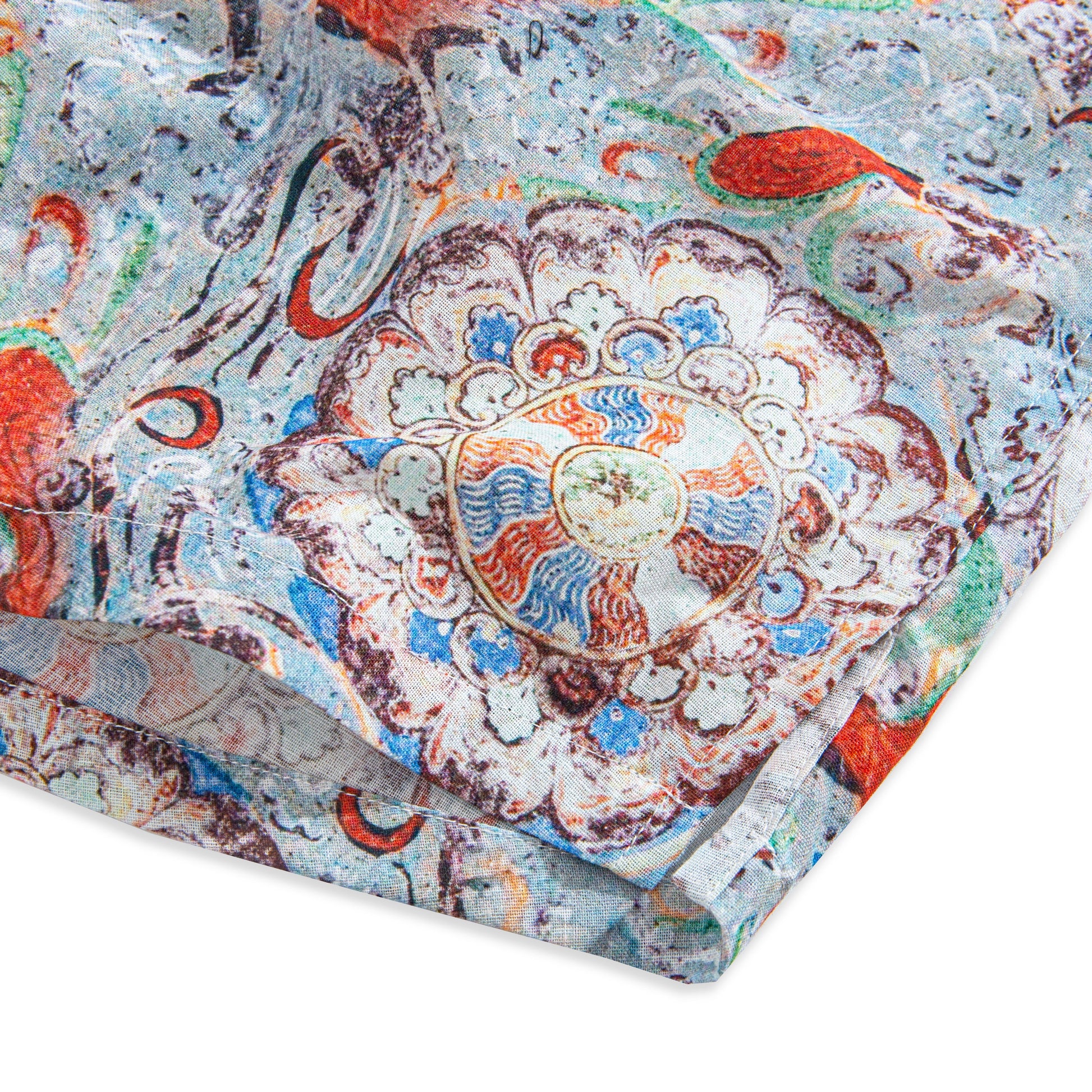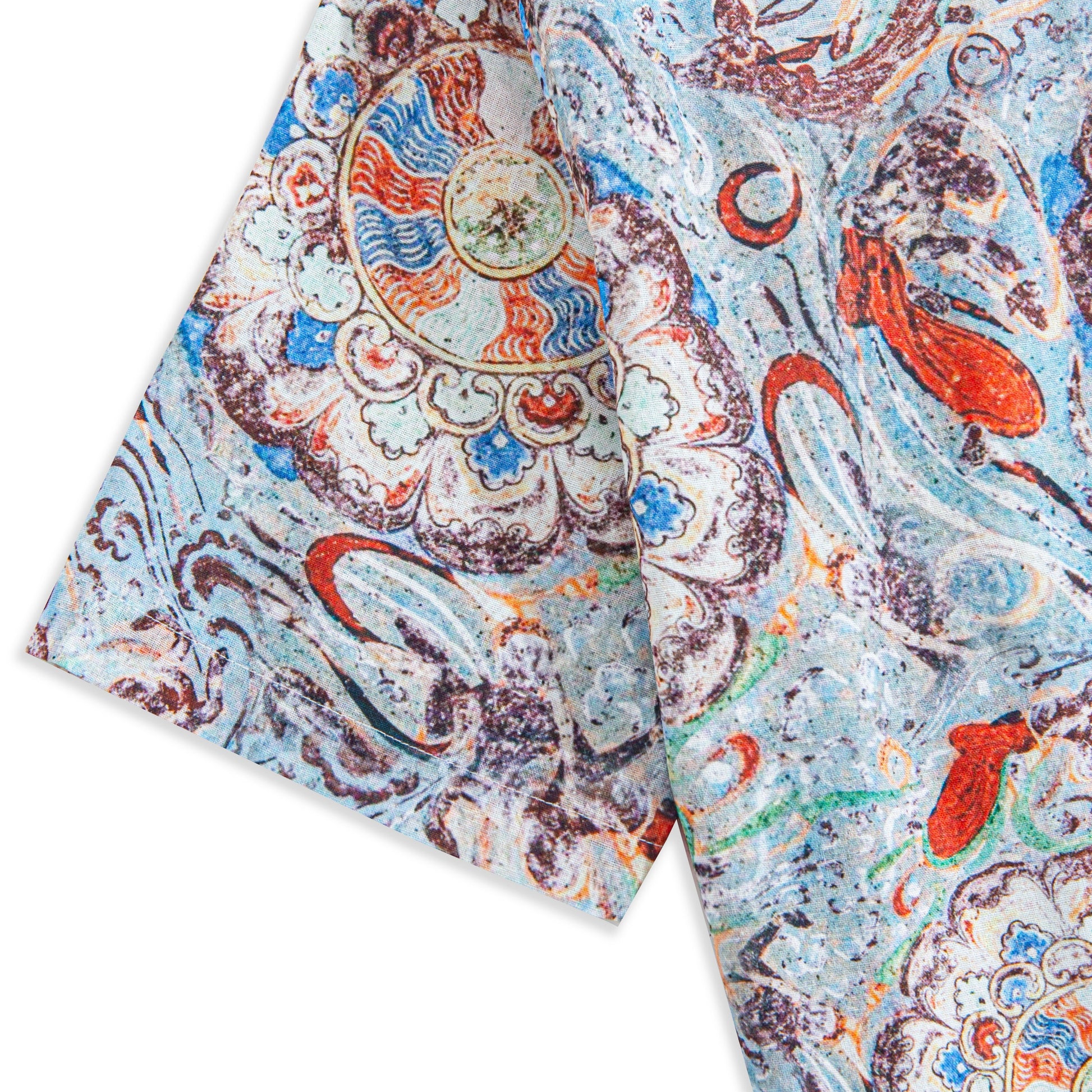 This is a wearable artwork, the design pattern is inspired by the traditional Dunhuang murals. It depicts a scene of koi swimming around a lotus. In early Eastern beliefs, a full bottle would represent water, and a lush lotus would grow in a bottle filled with water, symbolizing endless life and abundance.