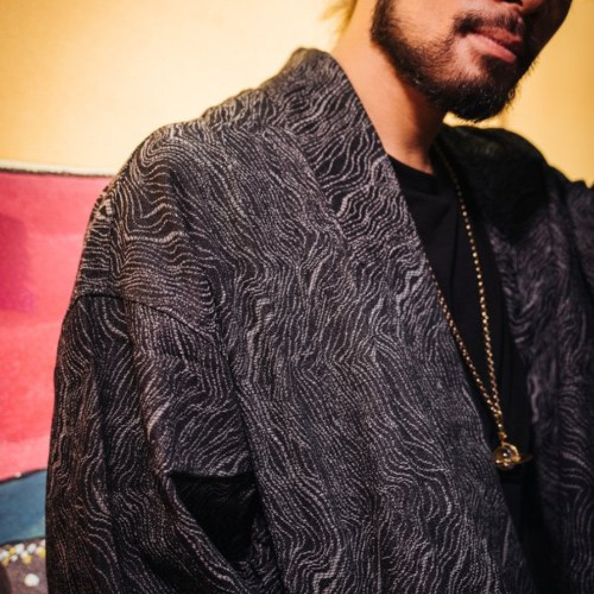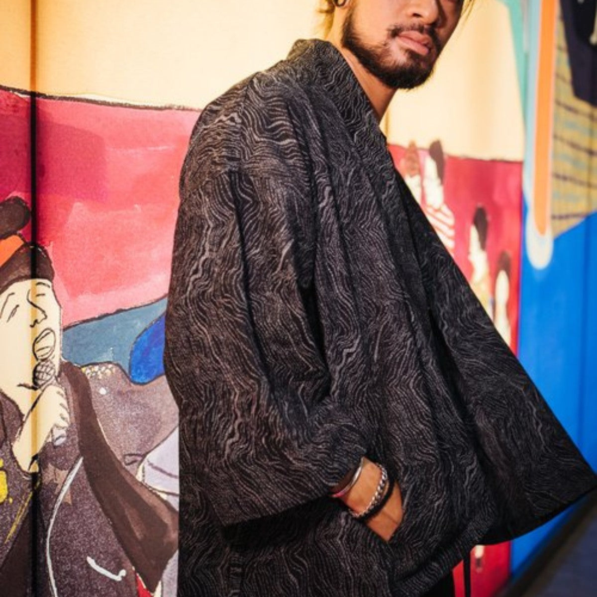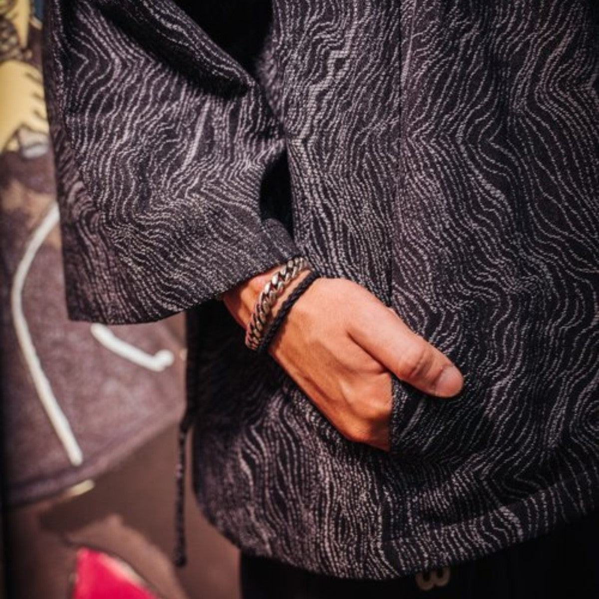 Carefully sewn from high-quality cotton and hand-dyed in the Japanese artist design – the iconic 'Black Ocean Waves' pattern – this [Kimono Haori Jacket] presents a uniquely rustic texture due to its subtly uneven weave.