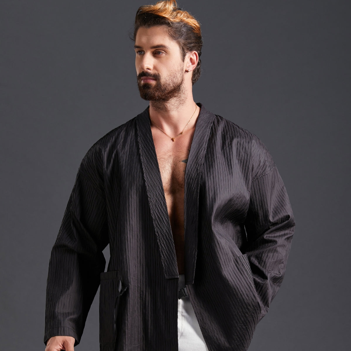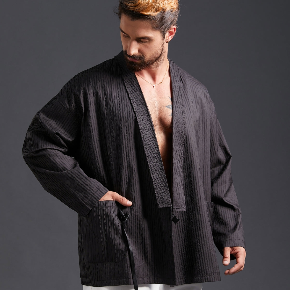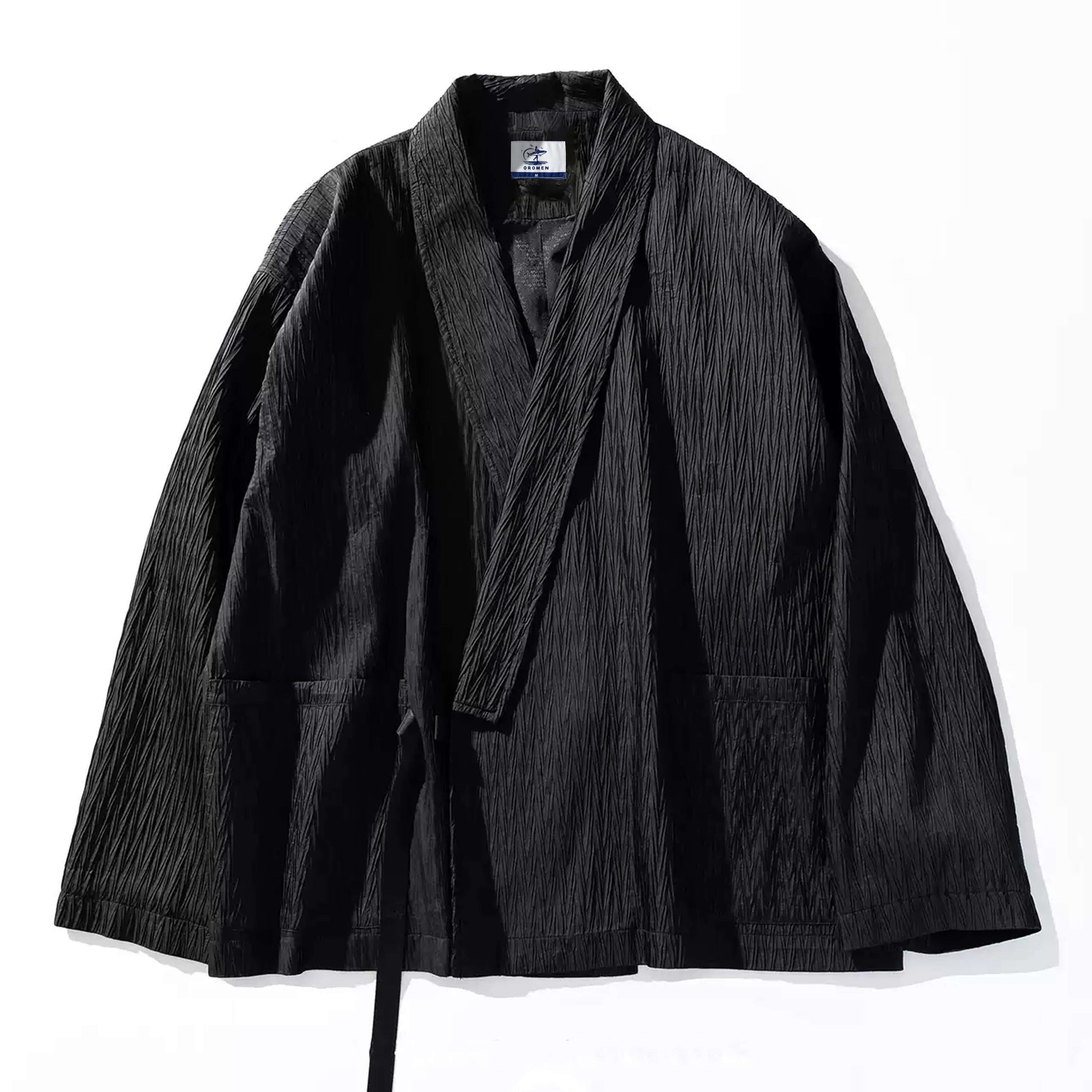 This [Men's Kimono Haori Jacket] is carefully crafted by Japanese craftsmen. After modern improvements, the traditional waist tie rope is changed to a buckle design. The wrinkled texture design makes it more layered visually and more suitable for modern life.
